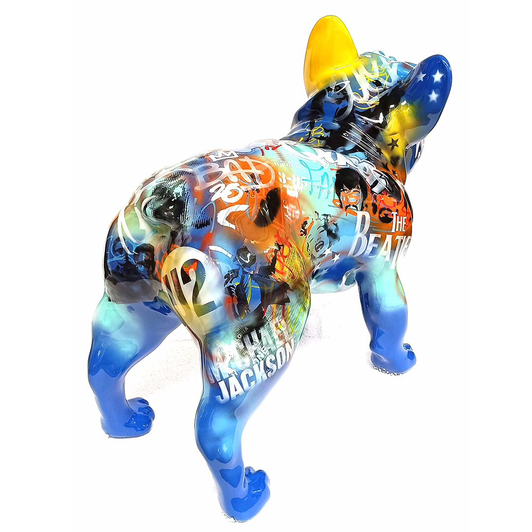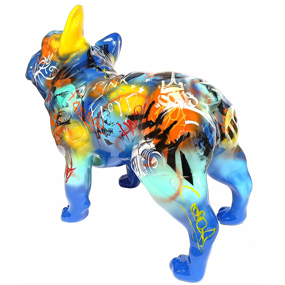 En livfull och uttrycksfull konstskulptur i form av en fransk bulldog, handmålad i färgsprakande pop art-stil. Varje exemplar är unikt, tillverkat i harts och stenpulver, numrerat och signerat – ett konstverk som ger både färg och personlighet till rummet.