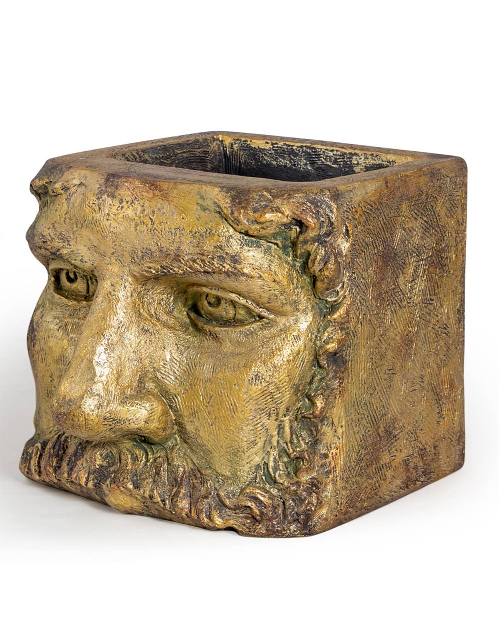 Dekorativ planteringskruka i klassisk antik stil med detaljrikt ansikte i relief. Tillverkad i slitstarkt material med vacker guldfinish. Passar perfekt som statement-piece både inomhus och på uteplatsen under årets varmare månader.